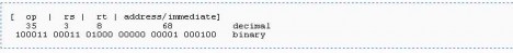 rs, rt, dan rd menunjukkan daftar Operand; shamt memberikan jumlah pergeseran dan alamat atau lapangan langsung berisi operand langsung.